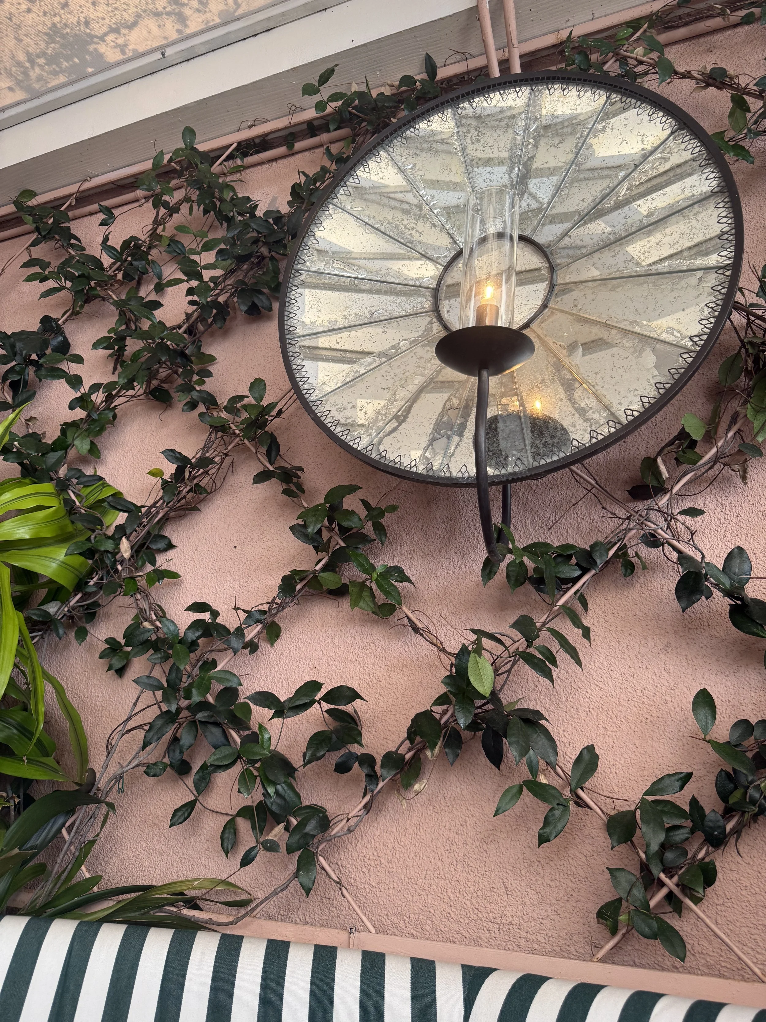 Striped chairs. Pink walls framed by diamond-shaped metal. Vines crawling and art that is catching the light.