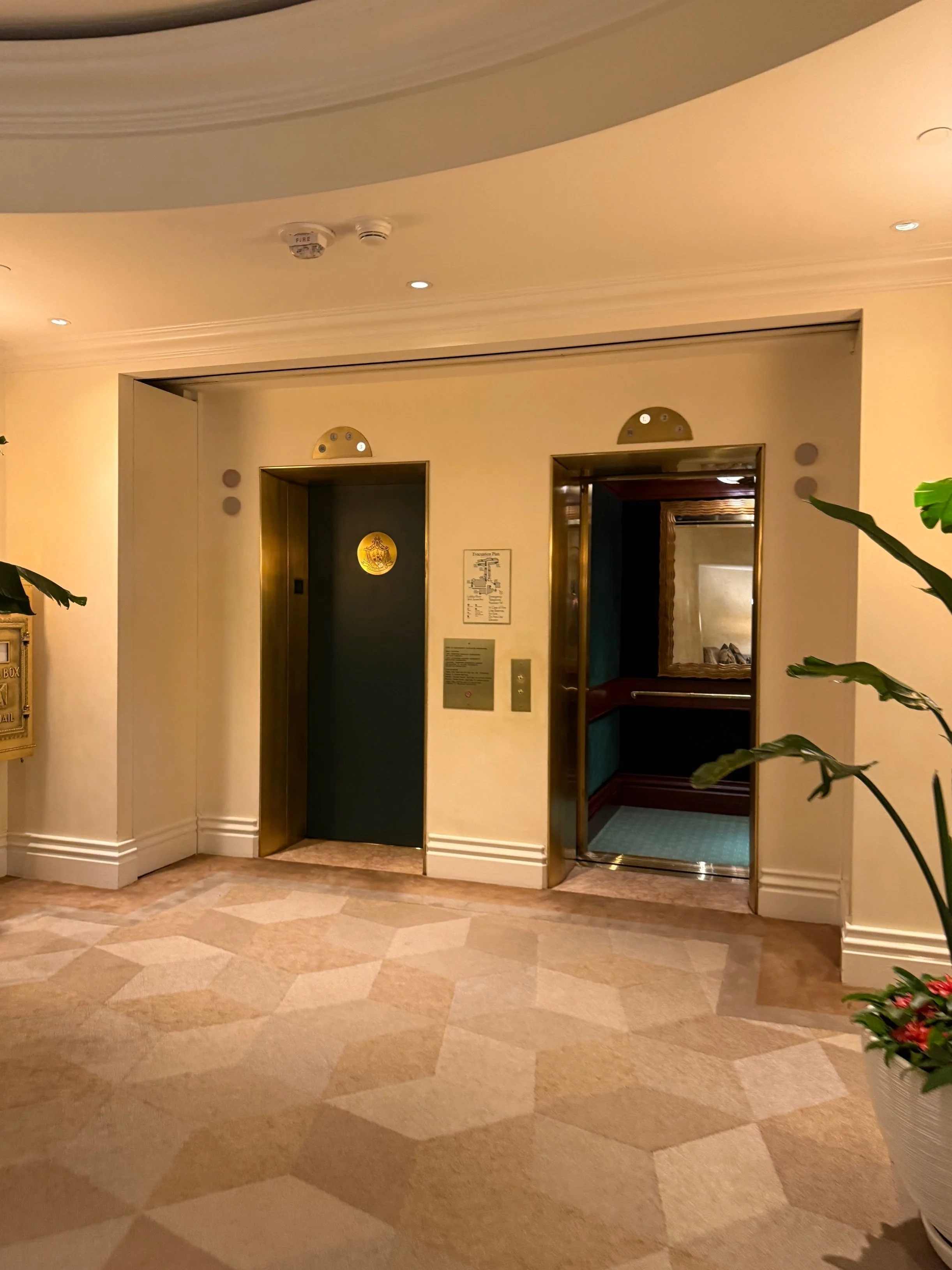 To the right, two elevators — soft green interiors, custom logos — feel like a portal to a different time.