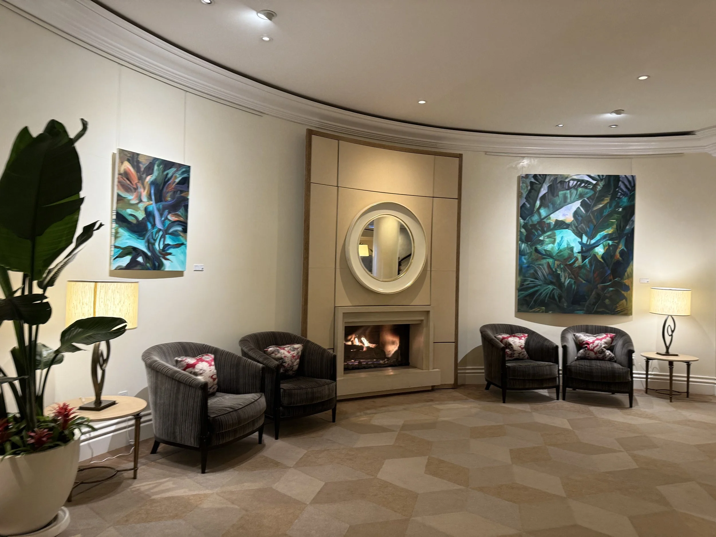 Back inside — leafy patterns down the staircase, past the boutiques I’d glimpsed earlier, soft lighting…